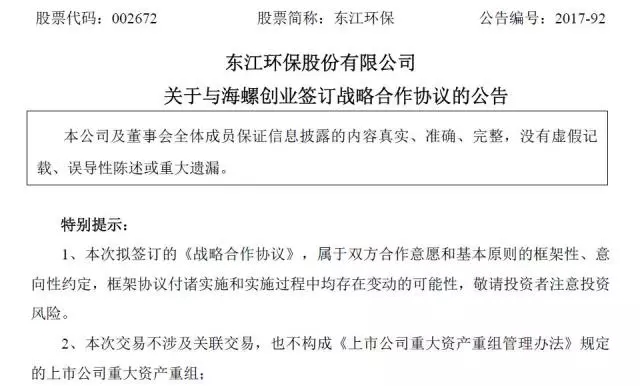 12月4日下午,東江環(huán)保發(fā)布公告稱,公司擬與中國(guó)海螺創(chuàng)業(yè)控股有限公司(下簡(jiǎn)稱“海螺創(chuàng)業(yè)”)于2017年12月6日簽署《戰(zhàn)略合作協(xié)議》,就水泥窯協(xié)同處置固廢事宜達(dá)成戰(zhàn)略合作意向。預(yù)計(jì)雙方將在固廢處理領(lǐng)域?qū)崿F(xiàn)強(qiáng)強(qiáng)聯(lián)合、優(yōu)勢(shì)互補(bǔ),共同推進(jìn)危廢處理行業(yè)的健康發(fā)展。來(lái)源:中證網(wǎng)海螺創(chuàng)業(yè)海螺創(chuàng)業(yè)是一家在香港聯(lián)合...
