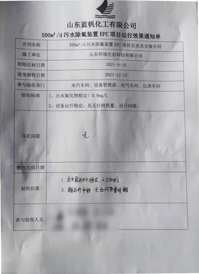 2021年12月15日,環(huán)瑞生態(tài)深度除氟<0.8mg/L項目——《藍帆化工煤造氣廢水深度除氟項目》順利通過竣工驗收! 項目運行效果通知單 經(jīng)過三個月的艱苦奮戰(zhàn),順利完工驗收,系統(tǒng)連續(xù)運行三個月出水完全達標,出水氟離子濃度穩(wěn)定<0.8mg/L,且無裝置設備運行質(zhì)量問...