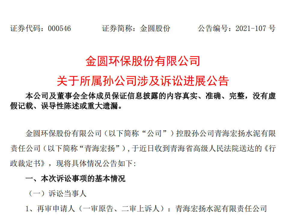 因?yàn)?萬元的環(huán)保處罰,導(dǎo)致3655萬元稅收優(yōu)惠沒有了,是不是有點(diǎn)因小失大?2021年12月29日,金圓環(huán)保股份有限公司(下稱“金圓股份”)發(fā)布公告,宣布了一起所屬孫公司青海宏揚(yáng)水泥有限責(zé)任公司(下稱“青海宏揚(yáng)”)涉及訴訟的進(jìn)展,青海宏揚(yáng)要求確認(rèn)環(huán)保處罰無效的再審申請(qǐng)被法院駁回。這意味著,經(jīng)歷了一審、...