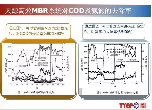 天源環(huán)保有10多年的深入摸索,對內(nèi)置式MBR,外置式MBR分別具備大量工程應用,對其優(yōu)缺點很明顯,并且針對性解決各自的瓶頸問題。由上圖可以看到當MBR運行穩(wěn)定后,對COD的去除率為80%~90%,對氨氮的去除率達到99%。