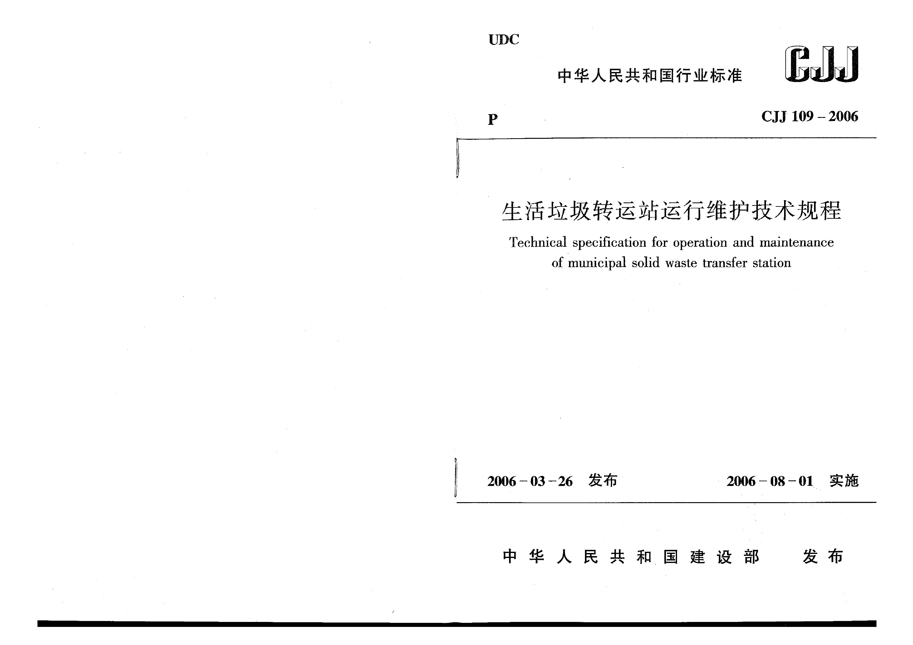 生活垃圾轉(zhuǎn)運站運行維護(hù)技術(shù)規(guī)程(CJJ 109-2006)