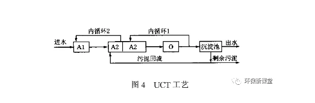 在常規(guī)A2/O工藝中,由于厭氧區(qū)在前,回流污泥不可避免地將一部分硝酸鹽帶入該區(qū)。硝酸鹽的存在嚴(yán)重影響了聚磷蓖的釋磷效率,尤其當(dāng)進(jìn)水中VFA較少,污泥的含磷量又不高時,硝酸鹽的存在甚至?xí)?dǎo)致聚磷菌直接吸磷。所以在常規(guī)A2/O工藝框架下,如何避免硝酸鹽進(jìn)入?yún)捬鯀^(qū)干擾釋磷一度成為研究熱點(diǎn),并圍繞這一問題產(chǎn)生了諸如UCT工藝,JHB工藝,EASC工藝等,其中最著名的應(yīng)屬UCT工藝(如圖4) 。