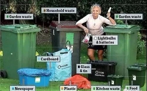 在英國(guó),每家每戶(hù)都有至少3種顏色的帶滾輪垃圾桶,并且垃圾桶上還會(huì)有各家的門(mén)牌號(hào)碼。垃圾桶由Cherwell(相當(dāng)于中國(guó)的社區(qū)居委會(huì))統(tǒng)一制作,居民自行購(gòu)買(mǎi)。垃圾回收費(fèi)用為一年145鎊。每周回收的垃圾桶顏色不同,這周收綠桶,下周收藍(lán)色和褐色的桶。