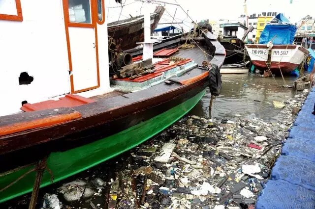 Versova海灘的部分垃圾來自于附近的街區(qū),而更大一部分來自于默拉得河(Malad Creek)的雨水排水管。河面看起來仍然很漂亮,但實(shí)際上,遠(yuǎn)岸的紅樹林,以及??吭诟咚坏?/span>漁船間隙中,是成堆成堆的垃圾。