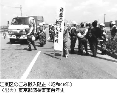 另一方面,江東區(qū)政府和區(qū)民也慢慢意識到,都政府關于垃圾填埋到1970年為止的承諾,根本沒有實現(xiàn)的可能性。到了1971年,平均每天有5000輛以上的搬運車,將東京中心23區(qū)所生產的垃圾中的70%搬運到江東區(qū)進行填埋。由此產生的交通堵塞、蚊蟲叢生、空氣污染甚至是火災,給江東區(qū)區(qū)民的日常生活造成重大困擾。