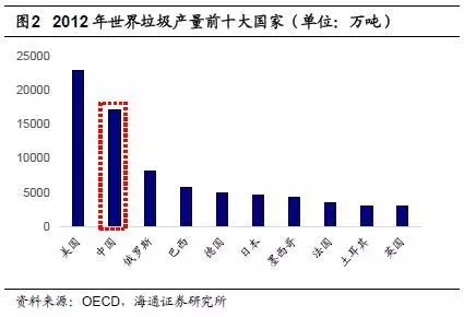 我國城鎮(zhèn)垃圾產量巨大。根據國家統(tǒng)計局數據,2000年我國的常住人口城鎮(zhèn)化率僅為36.22%,到2015年末為56.1%,年均增加1.33個百分點,城鎮(zhèn)人口的不斷增加使得城鎮(zhèn)生活垃圾產生量與日俱增。根據OECD數據,2012年我國垃圾清運量僅次于美國,高居世界第二位,且遙遙領先于后面的俄羅斯、巴西、德國等國家。根據國家統(tǒng)計局數據,2001年我國垃圾清運量為1.35億噸,2015年為1.91億噸,CAGR為3.27%。