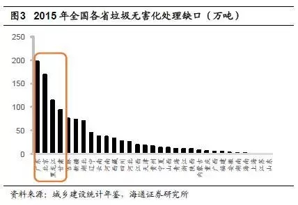 城鎮(zhèn)垃圾無害化處理缺口巨大。以人均垃圾產生量1.2kg/日來計算,2015年我國城鎮(zhèn)垃圾生產總量為3.38億噸,而2015年我國垃圾清運量為1.91億噸,對應缺口巨大。另一方面,從清運量看,2015年我國生活垃圾無害化處理量為1.8億噸,無害化處理率為94.1%,對應全國無害化處理總缺口為1129萬噸,分省區(qū)來看,缺口最大的有廣東(196萬噸)、北京(168萬噸)、黑龍江(114萬噸)、甘肅(94萬噸)。2006-2015年間,我國生活垃圾無害化處理缺口累計超過3.6億噸。