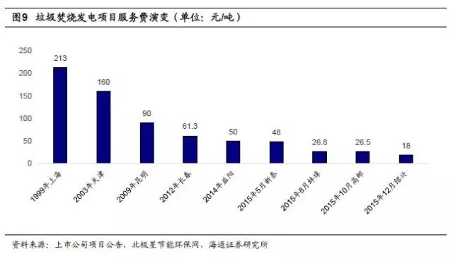行業(yè)競爭加劇,處理費下行。在市場參與者逐漸增多和行業(yè)競爭逐步加劇的背景下,近年新建的垃圾焚燒項目處理費呈下降趨勢。2015年以來,一些企業(yè)為了搶占市場而壓低價格,低價中標項目涌現(xiàn):2015年山東新泰項目中標價48元/噸,安徽蚌埠項目中標價26.8元/噸,江蘇高郵項目中標價26.5元/噸,浙江紹興項目中標價更是降至18元,擾亂市場正常秩序。除去少數惡意壓低價格的項目,根據中國經濟導報統(tǒng)計,近年來垃圾焚燒特許經營項目處理費每噸平均在60~80元,整體呈現(xiàn)小幅下降的趨勢。
