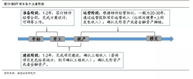 對項目公司而言,項目中標后,主要會經歷三個階段,分別是準備階段(一般為1-2年,完成項目的前期準備工作,簽訂特許經營合同,完成環(huán)評、可研報告等工作)、建設階段(一般為1-2年,完成項目建設,確認工程收入,若項目外包給其他方,則不確認)和運營階段(在特許經營期內,負責項目的運營,獲取垃圾處理費補貼和上網發(fā)電收入),特許經營期到期之后,項目無償移交給政府。