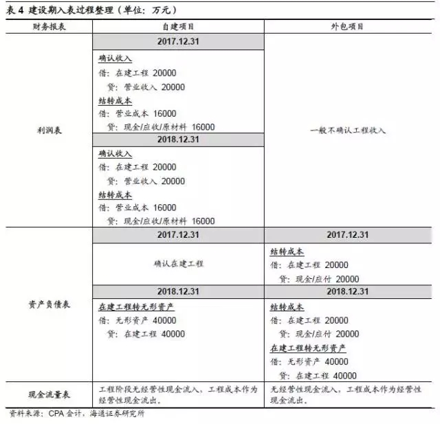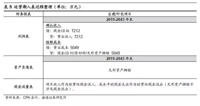 若該項目為項目公司自建,則建設期項目公司將根據完工進度確認工程收入并計入在建工程,項目完工后在建工程轉為無形資產,工程階段雖有工程收入并確認利潤,但并無實際經營性現(xiàn)金流入。若項目公司將項目發(fā)包,通常不確認工程收入,即建造期不影響利潤表,根據完工進度向承包方支付工程款,確認在建工程,項目完工后將在建工程結轉為無形資產。項目運營階段,公司確認項目運營收入(主要是垃圾處理費和上網發(fā)電收入),結轉相關成本,成本項包含無形資產的攤銷。項目建設期和運營期的主要會計科目錄入如表4和表5: