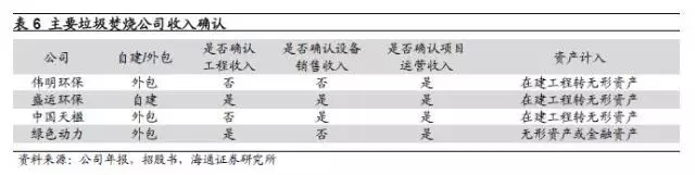 通常而言,對于垃圾焚燒BOT項目,如果公司自建,則會確認工程收入,如果將項目外包,則不確認工程收入。四家公司中,盛運環(huán)保項目主要為自建,并且確認工程收入,而偉明環(huán)保和中國天楹主要采取外包的方式,不確認工程收入。綠色動力有所不同,公司將項目發(fā)包給其他方,但考慮到其對項目負有整體履約責任并承擔所有費用和風險,在項目建造階段確認相應的建造收入,該等建造收入根據獨立評估師評定的公允價值計量。此外,盛運環(huán)保和中國天楹確認設備銷售收入,偉明環(huán)保與綠色動力則不確認,四家公司都確認項目運營收入。