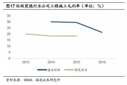 盛運環(huán)保和綠色動力兩家公司確認工程業(yè)務收入。工程業(yè)務毛利率方面,盛運環(huán)保相對較高,2015年為29.4%,2016年下降至21.3%;綠色動力雖確認工程業(yè)務收入,但項目主要系外包給其他方,建造收入根據獨立評估師評定的公允價值計量,毛利率較低,2015年為18.3%。