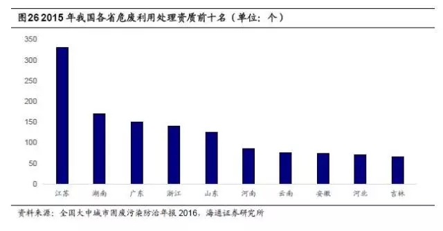 我國危廢綜合利用與處置行業(yè)格局分散,市場集中度較低。2015年全國危廢許可證(含醫(yī)療危廢)數量為2034個,較前一年增加113個,其中江蘇省頒發(fā)的危廢許可證數量為327個,數量上排名第一,湖南、廣東分列二、三位,數量在150個左右,浙江、山東也超過100個。截止到2015年,全國危險廢物經營單位核準經營規(guī)模達到5263萬噸/年,其中核準利用規(guī)模為4155.1萬噸/年,核準處置規(guī)模為982.4萬噸/年,平均每個許可證僅對應2.59萬噸/年的利用和處置能力。根據2008年環(huán)保部公布的危廢處置名單,當時全國1500多家具有危廢處理資質的企業(yè)中,處理能力達到1000噸/日的企業(yè)僅占0.3%,目前行業(yè)格局沒有太大變化。