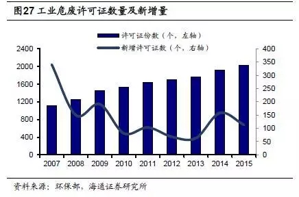 我國政府對危廢處理行業(yè)實行許可證制度。這一方面能夠保證從事危廢處理業(yè)務的公司基本擁有較強的技術實力和項目經驗,從而保障危廢無害化處理的效率,減少處理不當造成的二次污染;另一方面,實行許可證制度會限制新進企業(yè)數量,限制全國危廢綜合利用和處置總量。