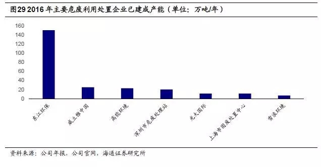 東江環(huán)保龍頭地位顯著。截止2016年底,東江環(huán)保已擁有國家危險廢物名錄中46大類中的44類危廢經營資質,僅次于威立雅中國,公司危廢利用和處置資質近150萬噸/年(其中無害化處置資質達到72萬噸/年),遠遠高于威立雅中國,另根據公司規(guī)劃,預計到2020年總產能將達到350萬噸(其中無害化產能達到200萬噸),增長空間可觀。
