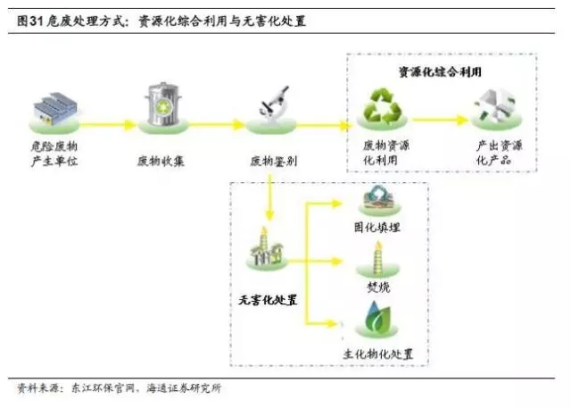 危廢無害化處置業(yè)務的盈利模式是賺取危廢處理費。危廢處理企業(yè)向工業(yè)廢物生產者收取處置費,收集其產生的工業(yè)危廢,對危廢進行無害化、減量化及最終處置,具體處置方式有焚燒、物化、填埋等。如東江環(huán)保2017年擬通過定增募投的福建綠洲工業(yè)固體廢物無害化處置項目,其建設內容包括年焚燒處置能力2萬噸/年的回轉窯裝置、年物化處理危險廢物2萬噸的裝置和安全填埋2萬噸的裝置,項目建成后每年可綜合處理各類危險廢物共計6萬噸。