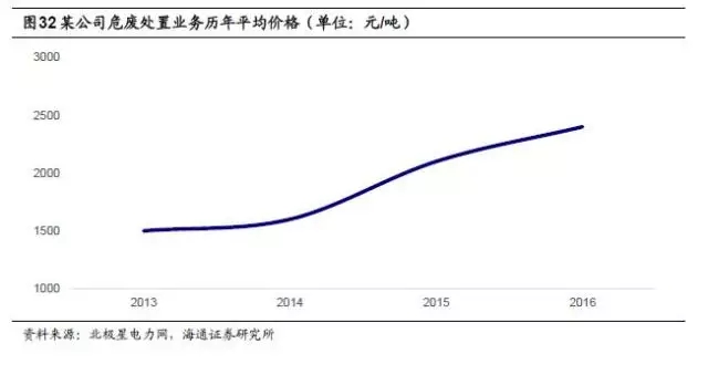 危廢處置價格穩(wěn)步上升,市場空間巨大。從核準經營規(guī)??矗U處置產能緊缺,2015年核準處置規(guī)模僅982.4萬噸/年。近年來,危廢處置價格呈現(xiàn)穩(wěn)步上升趨勢。以行業(yè)內某領先企業(yè)為例,2013年,其危廢處置業(yè)務平均價格為1500元/噸左右,2016年則上升至2500元/噸左右。以全國環(huán)境統(tǒng)計公報數據為基礎,假設未來幾年危廢產生量保持過去十年復合增長率12%的增速,保守估計處置率為35%,單位處置成本為2500元/噸,則預計2020年危廢處置市場為613億元,2017-2020處置市場空間總計2086億元。考慮到還有大量的危廢沒有進入國家統(tǒng)計口徑,若將這些量考慮在內,市場空間還將提升2-3倍。