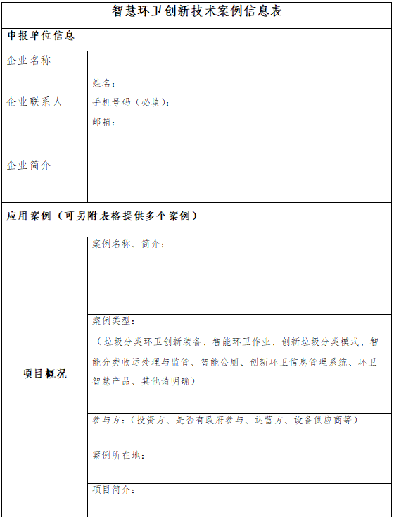 智慧環(huán)衛(wèi)是智慧城市的一個重要組成部分,智慧城市的建設(shè)迫切需要智慧環(huán)衛(wèi)的提升。在此背景下,中國環(huán)聯(lián)擬面向行業(yè)征集“智慧環(huán)衛(wèi)創(chuàng)新技術(shù)案例”,征集范圍包括垃圾分類環(huán)衛(wèi)創(chuàng)新裝備、智能環(huán)衛(wèi)作業(yè)、創(chuàng)新垃圾分類模式、智能分類收運處理與監(jiān)管、智能公廁、創(chuàng)新環(huán)衛(wèi)信息管理系統(tǒng)、環(huán)衛(wèi)智慧產(chǎn)品等的環(huán)衛(wèi)相關(guān)落地應(yīng)用項目案例。請有意向的企業(yè)按附件填寫申報表,并發(fā)郵件至以下郵箱地址。