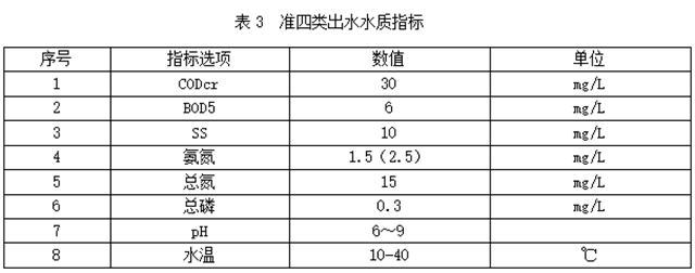 原水經(jīng)處理后,出水水質(zhì)達(dá)到《城鎮(zhèn)污水處理廠污染物排放標(biāo)準(zhǔn)》一級(jí)A標(biāo)準(zhǔn)或參照《地表水環(huán)境質(zhì)量標(biāo)準(zhǔn)》IV類(lèi)水的準(zhǔn)四類(lèi)水達(dá)標(biāo)排放,水質(zhì)指標(biāo)見(jiàn)下表: