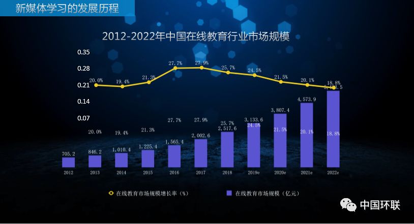 中國在線教育行業(yè)的市場規(guī)模發(fā)展上,已由2012年的705.2億元增長至2018年的2517.6億元,并基本保持20%以上的年增長率,預(yù)計到2022年可突破5000億元。2019年H1中國在線教育的市場細(xì)分結(jié)構(gòu)上,以高等學(xué)歷教育為主,占比49.6%;其次為職業(yè)培訓(xùn),占比25.5%;K12教育占比20.7%。當(dāng)前新媒體學(xué)習(xí)的用戶粘性持續(xù)加強,使用場景更加碎片化,線上學(xué)習(xí)已成為最主流的知識獲取方式。