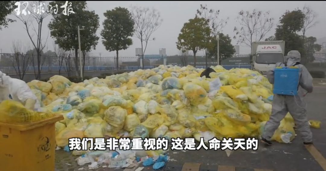 這些醫(yī)療廢物包括用過的防護服、手套、口罩、醫(yī)療用具甚至還有病患的嘔吐物。