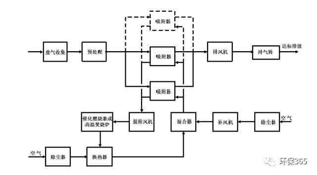 應(yīng)根據(jù)廢氣的來(lái)源、性質(zhì)(溫度、壓力、組分)及流量等因素進(jìn)行綜合分析后選擇工藝路線。根據(jù)吸附劑再生方式和解吸氣體后處理方式的不同,可選用的典型治理工藝有: