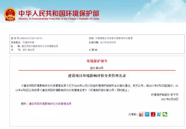 第八條 本名錄自2017年9月1日起施行。2015年4月9日公布的原《建設(shè)項(xiàng)目環(huán)境影響評價分類管理名錄》(環(huán)境保護(hù)部令第33號)同時廢止。