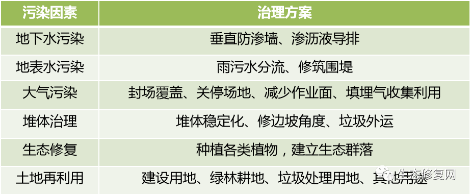 ? 三大任務(wù):污染控制、封場(chǎng)整治、生態(tài)修復(fù)? 可根據(jù)污染現(xiàn)狀、環(huán)境容量、投資、陳垃圾治理方式等制定治理方案