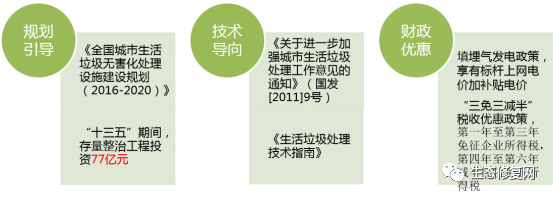全國(guó)老舊填埋場(chǎng)封場(chǎng)利用方式注:統(tǒng)計(jì)數(shù)據(jù)來(lái)自于十二五期間全國(guó)1236座非正規(guī)填埋場(chǎng)治理方案5、政府提供多方位政策支持