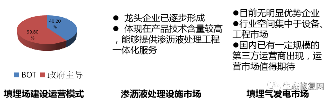 ? 填埋處理設(shè)施投資建設(shè)運(yùn)營(yíng)由政府主導(dǎo)逐步轉(zhuǎn)向市場(chǎng)化? 初步形成三大市場(chǎng):垃圾填埋場(chǎng)建設(shè)與運(yùn)營(yíng)市場(chǎng)、垃圾填埋氣體利用市場(chǎng)、垃圾滲瀝液處理市場(chǎng)? 場(chǎng)地修復(fù)、生態(tài)景觀修復(fù)市場(chǎng)空間有待釋放