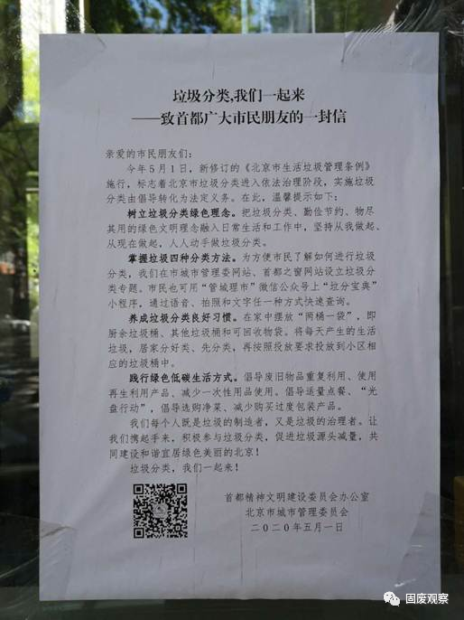 垃圾分類(lèi)的宣傳和指導(dǎo)如何進(jìn)一步加強(qiáng)?藍(lán)藍(lán)天工作室記者觀察自己所在的小區(qū)發(fā)現(xiàn),設(shè)了分類(lèi)垃圾桶,旁邊沒(méi)有專(zhuān)業(yè)指導(dǎo)人員,居民分不分類(lèi)、分得對(duì)不對(duì),基本全憑自覺(jué)。上海市剛推行垃圾分類(lèi)的時(shí)候,經(jīng)常有志愿者站在垃圾桶旁問(wèn)前來(lái)投放的居民“你是什么垃圾”。為啥北京很多小區(qū)目前沒(méi)人問(wèn)這樣的問(wèn)題?國(guó)務(wù)院發(fā)展研究中心資源與環(huán)境政策研究所副所長(zhǎng)常紀(jì)文表示,從5月1日《條例》開(kāi)始執(zhí)行后,他天天去附近小區(qū)拍照檢查??傮w看來(lái)垃圾分類(lèi)已經(jīng)起步了,各小區(qū)基本都配備了廚余垃圾桶等,但仍然存在一些問(wèn)題。例如,部分小區(qū)內(nèi)沒(méi)有宣傳橫幅,分類(lèi)垃圾桶邊沒(méi)有配備專(zhuān)人進(jìn)行指導(dǎo)監(jiān)督。一些小區(qū)宣傳和指導(dǎo)不到位,導(dǎo)致居民有分類(lèi)意識(shí),但缺乏分類(lèi)知識(shí)。“我在不少小區(qū)看到大家把外賣(mài)餐盒跟廚余垃圾扔在一起,但它屬于使用過(guò)的、沾了菜湯油污的塑料類(lèi)制品,應(yīng)該投放到其他垃圾桶中?!背<o(jì)文說(shuō)。在有的小區(qū),為保證每個(gè)分類(lèi)垃圾桶旁都有指導(dǎo)人員,取消了一些垃圾桶,讓居民走到較遠(yuǎn)的投放點(diǎn)扔垃圾。常紀(jì)文表示,他觀察到一些小區(qū)內(nèi)垃圾桶分布不均勻,有些樓棟下缺少?gòu)N余垃圾桶,有些沒(méi)有其他垃圾桶,“至少應(yīng)該以某種形式讓居民知曉,小區(qū)內(nèi)哪里有對(duì)應(yīng)的分類(lèi)垃圾桶,方便精準(zhǔn)投放?!?/span>劉建國(guó)認(rèn)為,現(xiàn)階段,應(yīng)進(jìn)一步加大宣傳教育和組織動(dòng)員力度,讓垃圾分類(lèi)真正“熱起來(lái)”;層層落實(shí)各級(jí)政府相關(guān)職能部門(mén)職責(zé),特別是切實(shí)落實(shí)管理責(zé)任人責(zé)任,將壓力和責(zé)任傳導(dǎo)到每個(gè)居民,讓垃圾分類(lèi)“硬起來(lái)”;統(tǒng)籌疫情防控和垃圾分類(lèi)兩項(xiàng)工作,讓二者有機(jī)結(jié)合,互相促進(jìn),讓垃圾分類(lèi)“動(dòng)起來(lái)”;北京的黨政機(jī)關(guān)、高??蒲性核?、企業(yè)總部、社會(huì)組織密集,應(yīng)帶頭做好源頭減量和垃圾分類(lèi),為居民作出表率、增添信心,讓垃圾分類(lèi)“亮起來(lái)”。“未來(lái),要從執(zhí)法保障、政策激勵(lì)、長(zhǎng)效機(jī)制、科學(xué)管理、多元共治、科技支撐等不同層面,不斷完善和優(yōu)化垃圾分類(lèi)投放、收集、運(yùn)輸、處理全鏈條,倒逼生產(chǎn)生活環(huán)節(jié)源頭減量,分類(lèi)物品物盡其用各得其所,降低垃圾分類(lèi)的綜合社會(huì)成本,促進(jìn)居民養(yǎng)成良好習(xí)慣,提升社會(huì)文明水平?!眲⒔▏?guó)說(shuō)。上圖:北京市有關(guān)部門(mén)致市民的一封信。(劉毅攝) 如何避免運(yùn)輸和處置中出現(xiàn)混裝混運(yùn)現(xiàn)象?不少居民表示,推行生活垃圾強(qiáng)制分類(lèi)以來(lái),自己所在的小區(qū),垃圾分類(lèi)的宣傳力度明顯加強(qiáng),做到了分類(lèi)投放、分類(lèi)運(yùn)輸。然而,也有居民表示,自己辛辛苦苦分好類(lèi),甚至把快遞盒上的膠帶都刮下來(lái)按類(lèi)別投放,結(jié)果發(fā)現(xiàn)垃圾車(chē)還是把所有垃圾一股腦混倒在一起運(yùn)走。劉建國(guó)表示,“前端分類(lèi),后端混合”是個(gè)廣受詬病的老問(wèn)題,實(shí)際上是垃圾分類(lèi)系統(tǒng)前后端不配套造成的。《北京市生活垃圾管理?xiàng)l例》中約束的一個(gè)主要對(duì)象,是從事垃圾收集運(yùn)輸處理的企業(yè),處罰門(mén)檻很低,處罰力度很大,就是為了解決先分后混、混裝混運(yùn)的問(wèn)題。“居民看到混裝混運(yùn)現(xiàn)象,可以馬上投訴,督促企業(yè)做好分類(lèi)收集運(yùn)輸處理。當(dāng)然,咱們自己也要做好分類(lèi)投放,不能以混裝混運(yùn)為借口而不履行義務(wù)。只有大家各負(fù)其責(zé),才能徹底杜絕混裝混運(yùn)現(xiàn)象。”劉建國(guó)說(shuō)。常紀(jì)文認(rèn)為,前端后端匹配才符合垃圾分類(lèi)的目的。對(duì)此需要標(biāo)本兼治:治本,需建設(shè)相匹配的廚余垃圾處置設(shè)施以及干垃圾的焚燒或填埋設(shè)施。治標(biāo),應(yīng)采取嚴(yán)格的處罰措施,沒(méi)有處罰,小區(qū)物業(yè)和環(huán)衛(wèi)部門(mén)往往會(huì)存有僥幸心理,使垃圾分類(lèi)工作停滯不前;只有嚴(yán)格執(zhí)行懲處措施,才能對(duì)垃圾分類(lèi)執(zhí)行方起到震懾作用,后端的各個(gè)環(huán)節(jié)才能順暢配合。為更好解決后端混運(yùn)問(wèn)題,常紀(jì)文還建議,改良垃圾運(yùn)輸車(chē)輛?!皻W洲有許多垃圾分類(lèi)車(chē)輛是能同時(shí)運(yùn)輸兩種垃圾的,我們也可以在設(shè)計(jì)方面做些改動(dòng),在車(chē)輛內(nèi)部進(jìn)行分隔,讓一輛車(chē)既可以運(yùn)廚余垃圾也可以運(yùn)其他垃圾,降低成本的同時(shí),方便操作?!?/span>劉建國(guó)認(rèn)為,疫情防控與垃圾分類(lèi)這兩件事并不沖突。現(xiàn)在疫情防控已經(jīng)進(jìn)入到常態(tài)化階段,可以把疫情防控中形成的好經(jīng)驗(yàn)好做法好機(jī)制,如社區(qū)精細(xì)化管理、居民