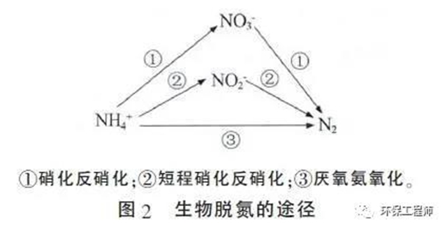 傳統(tǒng)生物硝化反硝化脫氮處理過程包括硝化和反硝化兩個階段。硝化過程是指在好氧條件下,在硝酸鹽和亞硝酸鹽菌的作用下, 氨氮可被氧化成硝酸鹽氮和亞硝酸鹽氮;再通過缺氧條件,反硝化菌將硝酸鹽氮和亞硝酸鹽氮還原成氮氣, 從而達到脫氮的目的。
