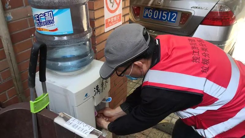 鳳六新苑垃圾投放點旁沒有條件裝洗手臺盆,小區(qū)物業(yè)經(jīng)理劉昌澄看了一眼閑置的飲水機,“就你了!”居民破袋時如果臟了手,就翻起垃圾桶旁飲水機上的把手,涓涓細流很快沖走了他們的煩惱。
