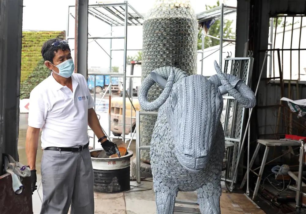 閔行區(qū)浦錦街道的兩網(wǎng)融合中轉服務站里,輪胎、金屬構件等可回收物被制作成各種頗具觀賞價值的“公共家具”,放置在口袋公園、小區(qū)花園里 李茂君 攝