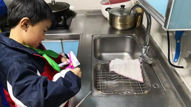 小磊已經(jīng)熟練掌握酸奶盒的分類步驟:剪開酸奶盒,倒掉剩余的酸奶;用水沖洗酸奶盒,晾干;把吸管扔進干垃圾桶,洗凈晾干的酸奶盒扔進可回收物桶
