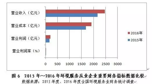環(huán)境服務(wù)從業(yè)企業(yè)(以執(zhí)行的會計制度劃分)營業(yè)收入以高于行業(yè)整體年均漲幅0.4個百分點的增速實現(xiàn)收入的持續(xù)拉升,占年收入總額的比重由2015年的92.4%小幅升至2016年的92.7%,2016年達(dá)2469.5億元,同比增長14.2%,實現(xiàn)營業(yè)利潤額194.2億元,同比上漲20.6%。由于勞動力成本、原材料價格、融資成本漲幅總體溫和,2016年企業(yè)營業(yè)成本同比增幅約13.6%,略低于營業(yè)收入同比增速,行業(yè)營業(yè)利潤率從2015年的7.4%小幅升至2016年的7.9%。
