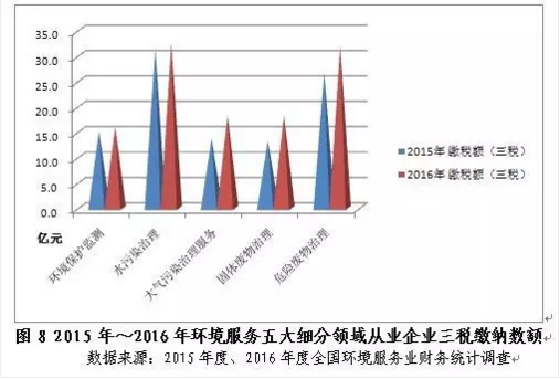 2016年企業(yè)繳納的營業(yè)稅金及附加、管理費用中的稅金、應(yīng)交增值稅之和同比增長18.5%,達(dá)125.7億元。五大細(xì)分領(lǐng)域中,水污染治理、危險廢物治理企業(yè)分別以32.5億元、31.9億元位居五大細(xì)分領(lǐng)域三稅繳納額的前兩位,分別貢獻(xiàn)了三稅總額的25.8%和25.4%。固體廢物治理企業(yè)2016年繳納三稅總額同比增速最大,達(dá)37.0%,這可能歸因于2016年我國城鎮(zhèn)化的深入推進(jìn),帶動了固體廢物處理領(lǐng)域市場空間的不斷擴(kuò)大,以及該領(lǐng)域明顯提高的營業(yè)利潤率。