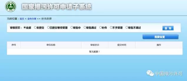 已經(jīng)取得排污許可證的排污單位可登錄國(guó)家排污許可申請(qǐng)子系統(tǒng),在業(yè)務(wù)辦理板塊選擇“許可證變更”模塊,申請(qǐng)變更排污許可證。
