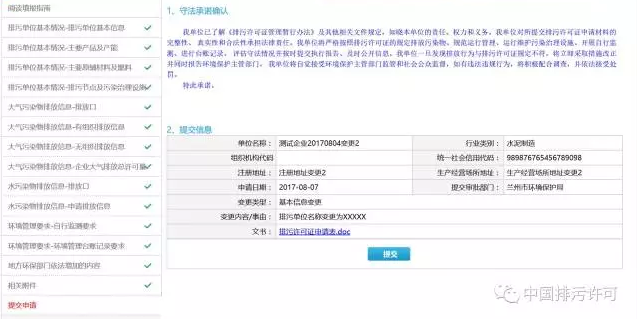 排污單位填寫完所有信息后,點(diǎn)擊“提交”按鈕,即完成排污許可證變更申報(bào)。系統(tǒng)會(huì)對(duì)變更內(nèi)容進(jìn)行標(biāo)識(shí),綠色文字為排污單位變更過程中新增內(nèi)容,紅色文字為排污單位變更過程中修改內(nèi)容。