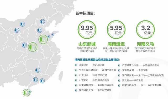 近日,博天環(huán)境集團(tuán)(603603.SH)通過聯(lián)合體合作方式分別贏取了位于山東省鄒城市、河南省義馬市和海南省澄邁縣的三個生態(tài)修復(fù)類項(xiàng)目。其中山東省鄒城市鄒西產(chǎn)煤塌陷區(qū)綜合治理PPP項(xiàng)目,投資概算約9.95億元;河南省義馬市澗河及石河生態(tài)綜合整治工程(PPP),項(xiàng)目總投資約3.2億元;海南省澄邁縣城鎮(zhèn)水環(huán)境綜合整治(大塘河、海仔河)PPP項(xiàng)目,估算總投資5.95億元。