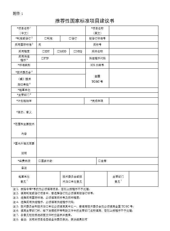 a. 《推薦性國家標(biāo)準(zhǔn)項(xiàng)目建議書》(一式三份,原件簽字、蓋單位公章,附電子版),見附件1。