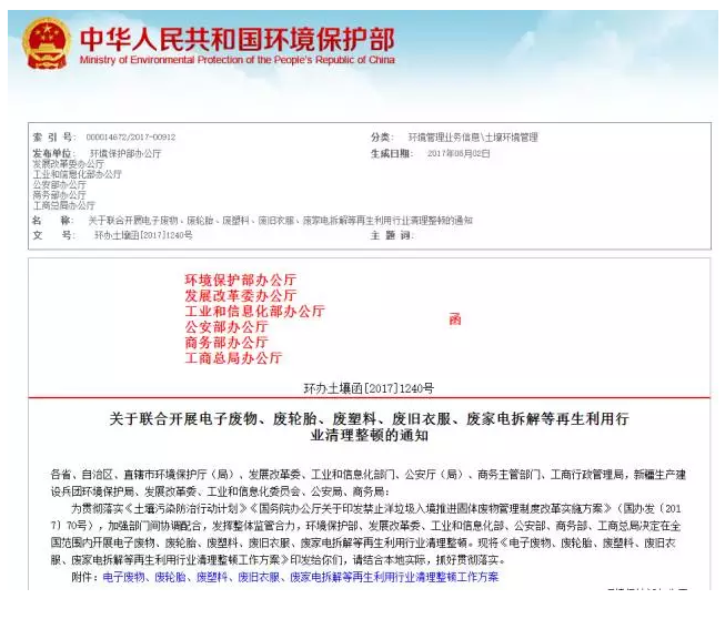 為貫徹落實(shí)《土壤污染防治行動(dòng)計(jì)劃》《國(guó)務(wù)院辦公廳關(guān)于印發(fā)禁止洋垃圾入境推進(jìn)固體廢物管理制度改革實(shí)施方案》(國(guó)辦發(fā)〔2017〕70號(hào)),環(huán)境保護(hù)部聯(lián)合發(fā)展改革委、工業(yè)和信息化部、公安部、商務(wù)部、工商總局開(kāi)展電子廢物、廢輪胎、廢塑料、廢舊衣服、廢家電拆解等再生利用行業(yè)清理整頓。