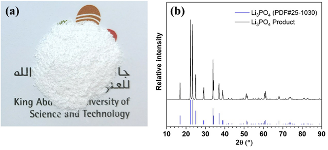 圖3.(a) 磷酸鋰產(chǎn)品;(b)磷酸鋰產(chǎn)品的XRD圖,附上標(biāo)準(zhǔn)圖譜作為對(duì)比。