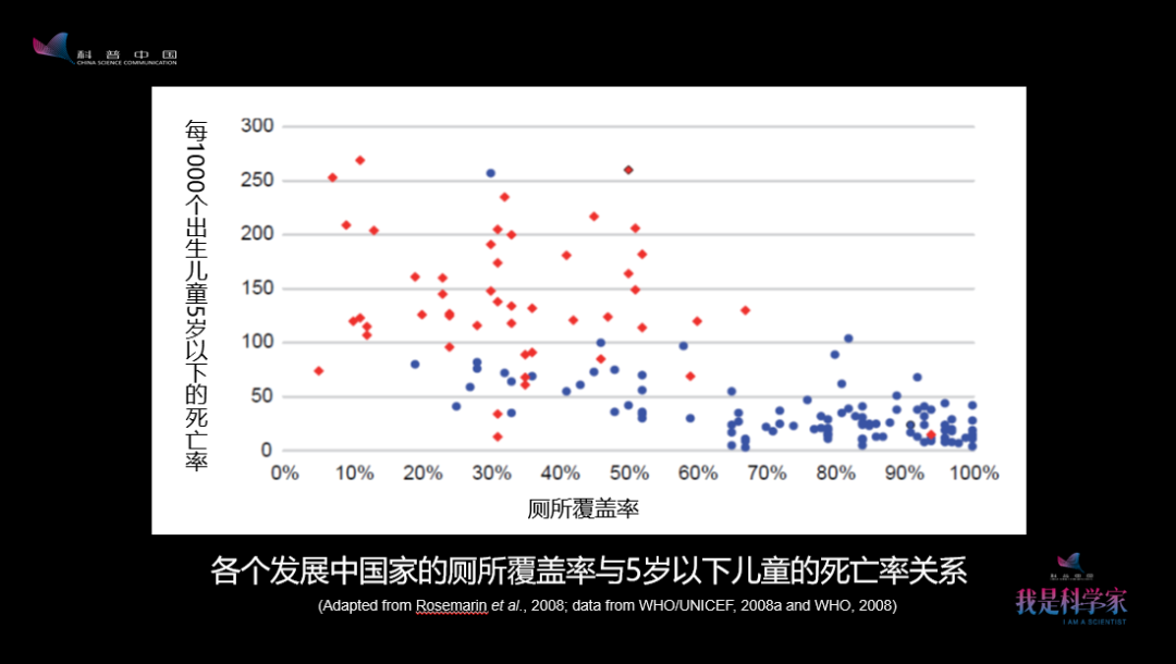 圖中最左邊的1000個兒童,5歲以下的死亡人數(shù)高達近300個,但如果是到了100%有衛(wèi)生廁所的這邊,死亡人數(shù)幾乎就是0了。這是用大數(shù)據(jù)證明了廁所和人類健康的關(guān)系——衛(wèi)生廁所的數(shù)量越多,兒童的死亡率越低。