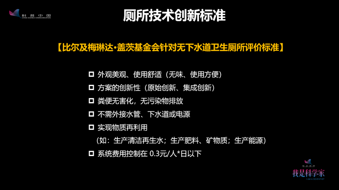 這是蓋茨基金會針對新型廁所提出的,從舒適度上、衛(wèi)生安全、資源化、經(jīng)濟上面提出了一系列的要求。你要創(chuàng)新,但需要滿足這些要求才能夠獲得基金會的支持。