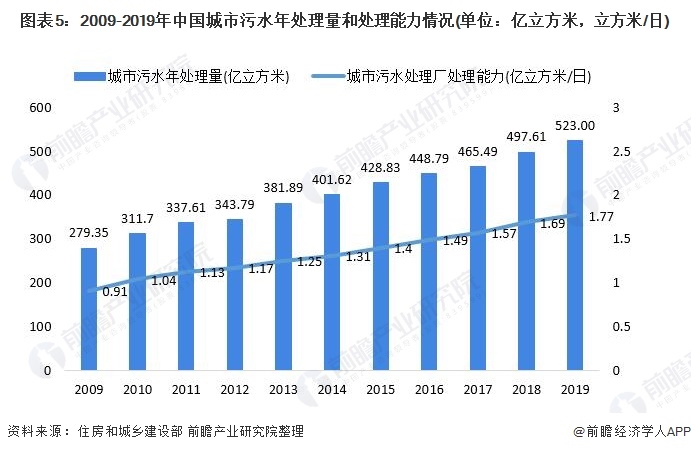 除了供水外,污水處理也是目前水務行業(yè)重點關注的領域之一。從污水處理的供給來看,由于城鎮(zhèn)化和經濟發(fā)展需求,中國城市近年來污水產生量和處理量呈上升趨勢。從城市污水處理情況來看,截至2019年底,全國城市污水處理廠處理能力1.77億立方米/日,累計處理污水量523億立方米。
