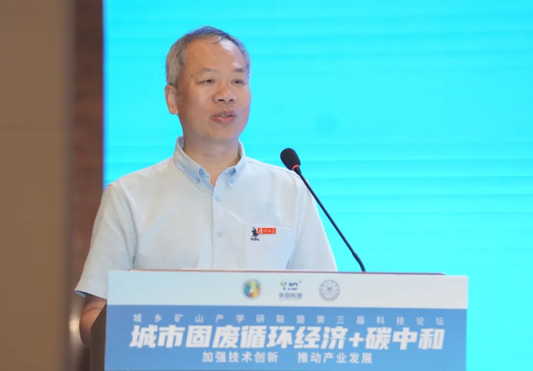 廈門大學(xué)校長(zhǎng)助理張建霖教授向大會(huì)致辭,介紹了廈門大學(xué)在“碳中和”領(lǐng)域工作情況,期待與城鄉(xiāng)礦山產(chǎn)學(xué)研聯(lián)盟,以及各科研單位攜手一道推進(jìn)無廢城市建設(shè)。