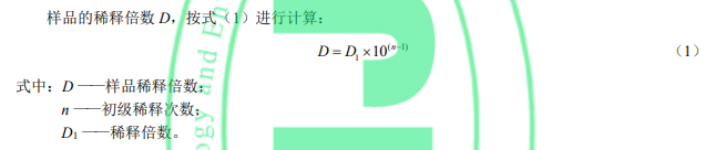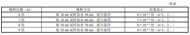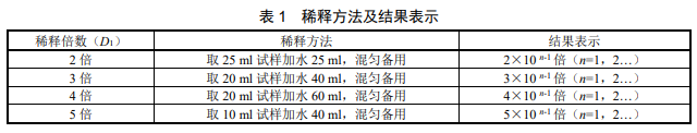用量筒(6.6)取第 n−1 次初級稀釋的試料,按照表 1 的稀釋方法由小到大逐級按自然倍數(shù)進行稀 釋,每稀釋 1 次,混勻后按目視比色方法(8.3)觀察,直到剛好與水(5)無法區(qū)別時停止稀釋,記錄稀釋倍數(shù) D1。