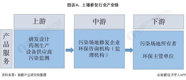 土壤修復行業(yè)上游包括相關藥劑和設備的研發(fā)設計、藥劑生產(chǎn)商、設備供應商及土壤污染監(jiān)測商,為土壤修復提供設備技術支持;行業(yè)下游通常為受污染場地的所有者或環(huán)保主管單位,土壤修復項目由下游企業(yè)提出并為項目出資。行業(yè)中游為一些土壤修復企業(yè)和環(huán)保咨詢機構。中游企業(yè)負責受污染地塊的前期調查、風險評估,中后期工程實施、竣工驗收以及后期的評估工作。