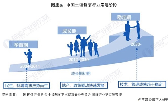 相較國外,國內土壤及地下水修復行業(yè)相對國外而言起步較晚,大致劃分為三個階段—孕育期、成長期、穩(wěn)定期,我國土壤及地下水修復行業(yè)目前處于成長期。
